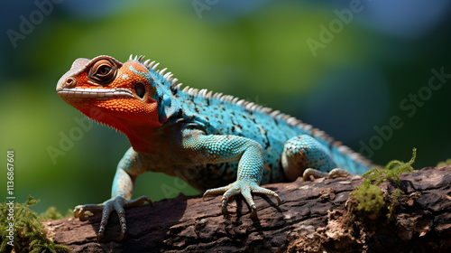 wildlife, nature, reptile, tree bark, foliage, turquoise, crimson, agile, captivating, mesmerizing, stunning, beauty, wilderness, closeup, lizzard, agama, scenic, fauna, flora, green, portrait, detail, ecology, environment, tropical, camouflage, adaptive, survival, biology, herpetology, texture, pattern, wild animal, trail, forest, jungle