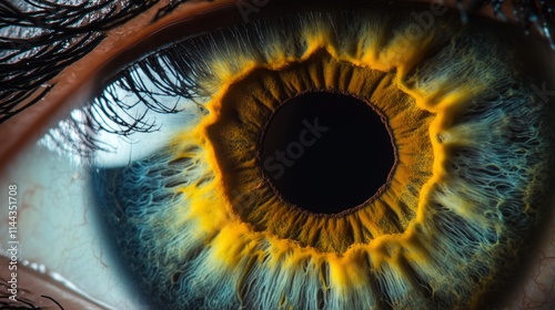 Vivid details of a human eye: close-up of blue and yellow patterns