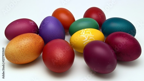 Vivid easter egg collection artfully arranged on a white surface for colorful spring celebrations
