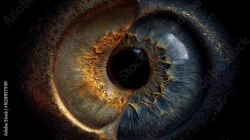 Vivid Eye Closeup: A mesmerizing close-up of a human eye, split to showcase the intricate details and unique color variations of iris, revealing the complexity and beauty of vision.