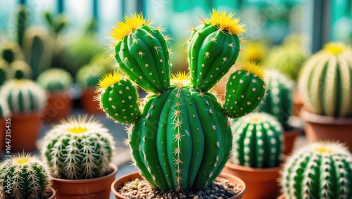 Vivid green cactus with yellow flowers in a pot surrounded by various cacti in a nursery or greenhouse setting.