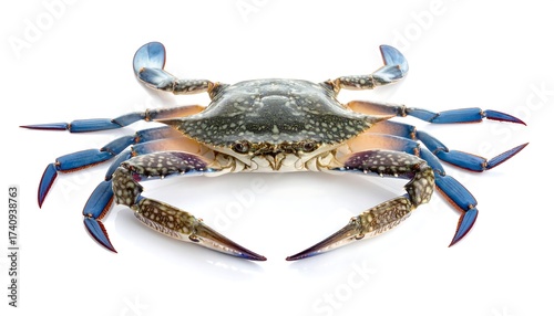 Vivid shot of a blue crab, its shell and legs in striking contrast against a clean white backdrop. The crustacean is isolated and fully visible