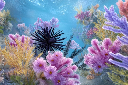 Vivid underwater scene with colorful corals plants a large dark sea urchin centerpiece