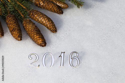 2016, wishes, happy new year, christmas, card, greeting card, christmas card, new year, seasons greetings, background, setting, year, snow, good, year, fir cone, fir, pine, outside, gold, gold, new year's eve, numeral, posed, three-dimensional, winter, snowy, cold, party, wish, white background