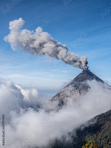 volcano, fire, mountain, hill, guatemala, old, nature, landscape, view, wild, eruption, powder, cloud, fog, forest, heaven, tree, mountain, green, day, outdoors, white, black, black-and-white, rock, volcano, travel, misty, peak