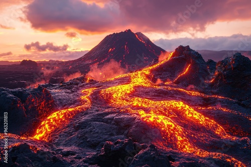 volcano, lava, eruption, sunset, fire, red, orange, yellow, hot, heat, nature, landscape, mountain, sky, cloud, dramatic, fiery, dangerous, powerful, earth, geologic, rock, magma, smoke, steam, glow, vibrant, incandescent, igneous, crater, flow, stream, ridge, peak, summit, hazard, disaster, destruction, natural disaster, force, power