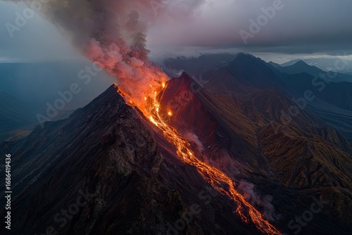 eruption, volcano, lava, fire, magma, smoke, mountain, landscape, aerial, dramatic, fiery, molten, hot, ash, plume, peak, ridge, slope, flow, red, orange, dark, cloud, sunset, sunrise, volcanic, geology, nature, disaster, hazardous, danger, geothermal, activity, powerful, intense, destruction, environment, heat, rock, science