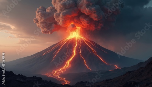 Volcanic eruption illustration. Fiery lava flows down mountain. Explosive clouds of ash, smoke, steam rise in sky at sunset. Natural disaster theme. Science, geology, environment, power, danger,