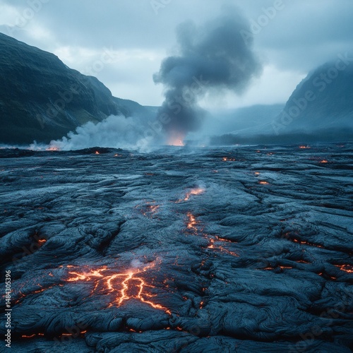 lava, landscape, mountain, nature, volcano, eruption, volcanic, lava flow, scenic view, outdoors, geology, dark, mist, steam, smoke, ash, fire, hot, molten, magma, surface, terrain, earth, environment, wilderness, peak, rock, formation, geologic, dramatic, rough, dangerous, powerful, destructive, force, natural disaster, impact, energy, glow, stream, fluid, scenic, view, cloudy, cloudy day