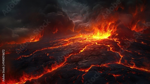 Volcanic Eruption Landscape with Lava Flow and Dramatic Cloud Formation