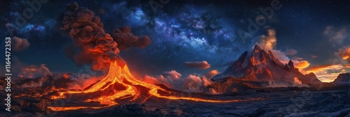 volcano, eruption, lava, fire, mountain, night, sky, star, galaxy, smoke, cloud, dark, orange, red, hot, glowing, landscape, nature, majestic, power, awesome, dramatic, intense, incredible, beautiful, cosmic, space, rock, texture, flow, stream, energy, light, darkness, surreal, fantastic, amazing, wonder, awe