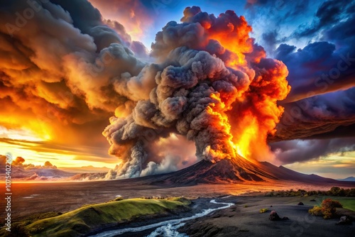 Volcanic Eruption with Fiery Lava and Dramatic Smoke Erupting from Crater – Stunning Nature Scene for Educational and Creative Use