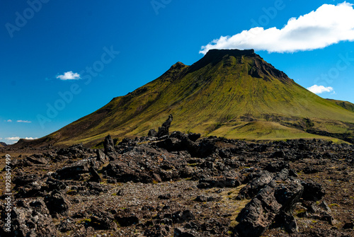 Volcanic landscape in Iceland with rocky terrain and green moss under blue sky. Dramatic Iceland nature scene with mountain peak, lava rocks, and wild highlands environment in natural light.