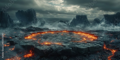 volcanic, landscape, lava, glowing, sky, stormy, dramatic, danger, rock, stone, mountain, dark, grey, orange, red, fire, heat, magma, earth, nature, fantasy, surreal, artistic, digital, art, illustration, design, concept, abstract, three-dimensional, render, scene, background, environment, earth, alien