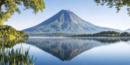 Volcanic mountain in morning light reflected in calm waters of lake.