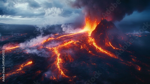 Volcano Erupts with Lava, Ash, and Smoke at Twilight