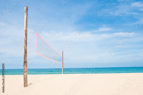 volleyball, beach, net, sand, sport, leisure, summer, sea, empty, ocean, nature, sky, white, water, sunny, travel, game, tropical, volley, blue, nobody, outdoors, recreation, activity, coast, fun