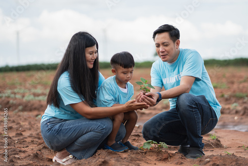 Volunteer families planting trees together to expand green space and support environmental conservation.