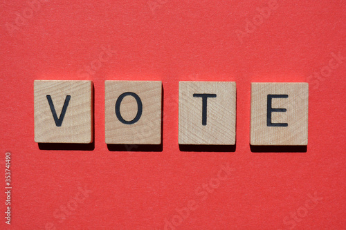 Vote, word in 3d wooden alphabet letters isolated on red background