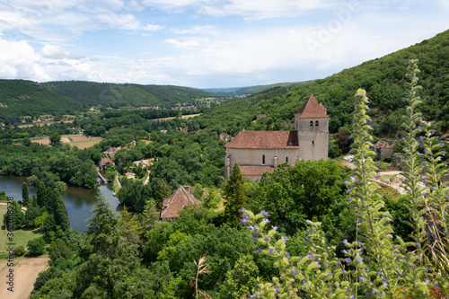 Vue sur l'église de Saint-Cirq-Lapopie et le Lot