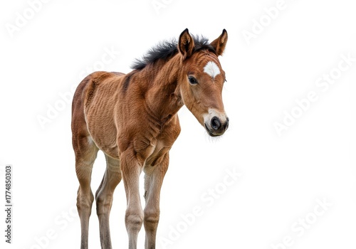Vulnerable young horse isolated on a plain white background. The newborn equine is prominent and perfectly focused, highlighting its delicate form ,spotted ,white background ,youth