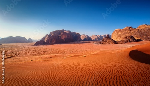 Wadi Rum Desert Sandstone Cliffs Arid Landscape Dramatic Rock Formations Orange Sand Clear Blue Sky Dramatic Lighting Serene Atmosphere Barren Environment Jordanian Desert Vast Expansive Sce
