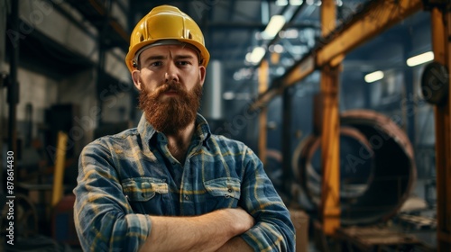 Waist up portrait of bearded factory worker wearing hardhat looking at camera while standing in workshop