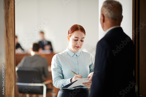 Waist up portrait of young woman holding clipboard talking to boss or business coach, copy space