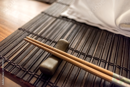 eatery, chopstick, asian, background, brown, cotton, dark, empty, japanese, napkin, nobody, object, table, traditional, utensil, wood, wooden