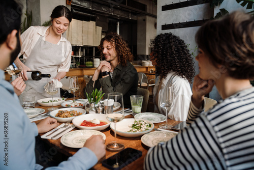 Waitress pouring wine into glasses while serving group of friends in restaurant
