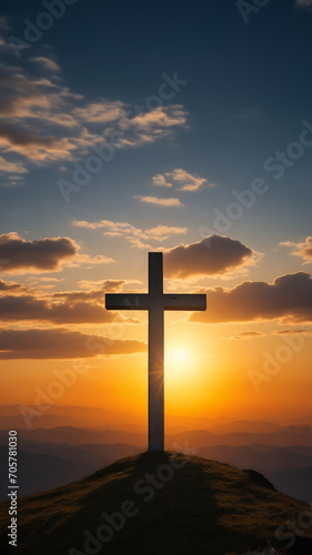Wake card, silhouette of a cross on the mountain with the sun in orange. Reminder concept for a funeral