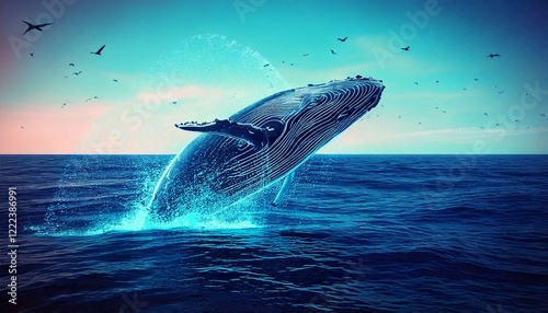 Wal an der Wasseroberfläche mit Vögel und Fischen als Wallpapper