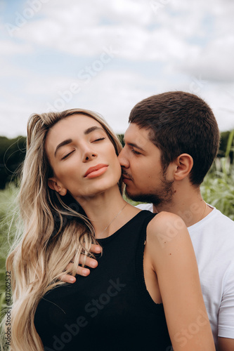 Walk a guy and a girl. Love story by the lake in the tall grass. Youth in nature. Summer day.