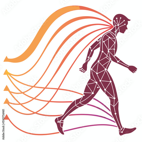 walking, figure, data transfer, concept, human, silhouette, network, connection, arrow, motion, technology, innovation, progress, futuristic, digital, communication, movement, path, direction, gradient, maroon, orange, purple, white, background, abstract, design, illustration, modern, art, graphic, symbol, shape, line, curve, dynamic, connectivity, system, flow, forward, advancement, growth