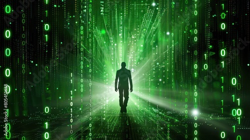 walking man, Green number and code matrix background,