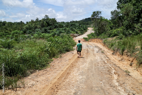 Walking on a dirt road in the middle of the forest. Kalimantan, Indonesia.