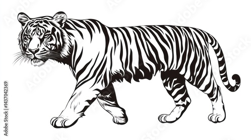 Walking tiger, wild animal, black and white, nature illustration, wildlife design