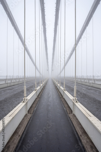 bridge, architecture, railway, river, train, steel, travel, transportation, escalator, station, city, building, railroad, metal, transport, rail, glasses, sky, road, construction, suspension, urban, perspective, structure, paseo, fog