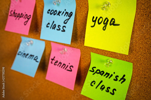 Wall board with colorful stickers reminders activities and hobbies of girl or lady: yoga Spanish cooking class tennis shopping cinema