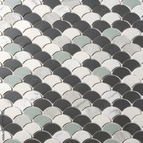 wall covered with a pattern of overlapping, scallop-shaped tiles. The tiles are arranged in a fish scale layout, creating a visually appealing texture