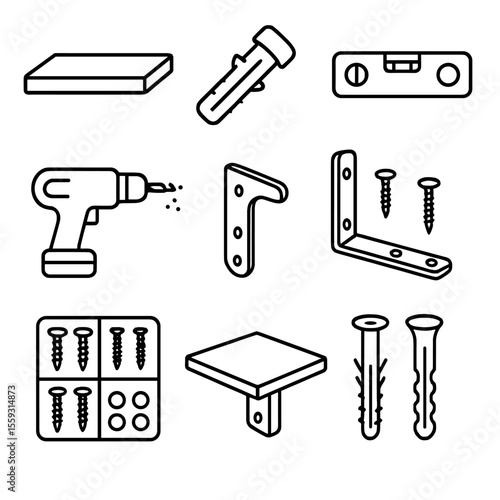 wall, fixture, icon, line, style, fixture, shelf, floating, shelf, anchor, level, tool, drill, into, bracket, support, assembly, screw, kit, corner, plug, text, label, isolated, transparent, background