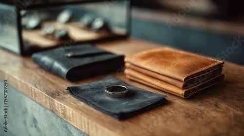 billfold, shopping, bag, counter, wooden, retail, minimalist, warm, overhead, commerce, purchase, sale, luxury, money, finance, payment, gift, discount, promotion, brand, store, display, product, accessory, leather