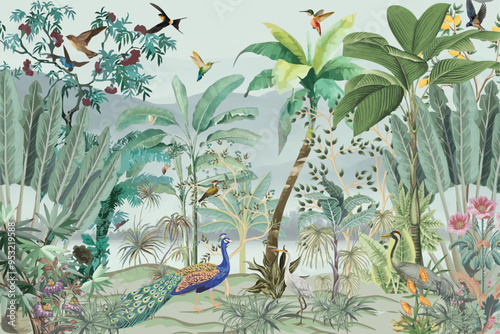 Wallpaper, Watercolor Mural,Wall Painting,Watercolor Background, Peacock, birds.