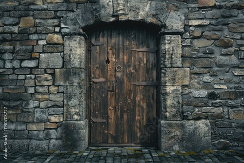 wallpaper with wooden old door and stone brick wall