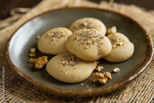 Walnut and chia seed cookies served on uneven ceramic plate with walnuts