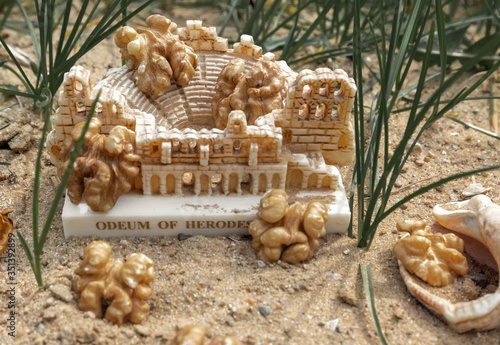 Walnut. Seashell. Green grass. Statuette. Nature. Abstraction.