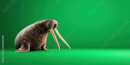 Walrus with long tusks on a vibrant green background.