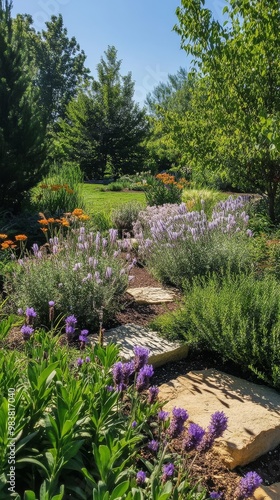 Wander through a lush garden filled with aromatic plants and colorful blooms under clear skies