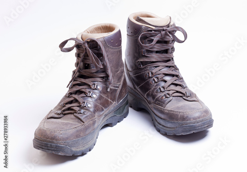 hike, leather, isolated, shoe, footwear, brown, white, couple, clothes, aged, lace, 2, walk, object, sturdy, wanderlust, active, nobody