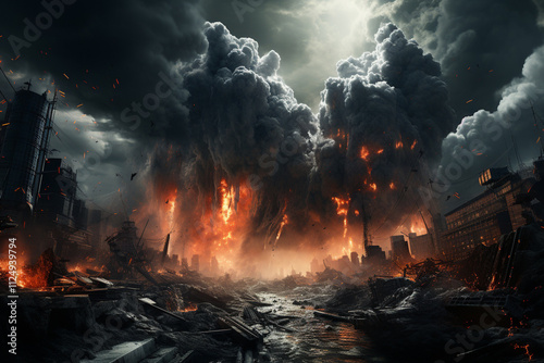 war, city, fire, explosion, fire, smoke, generative, ai, modern, high, rise, building, devastated, chaos, background, attack, destruction, explosion, building, urban, danger, disaster, apocalypse, dramatic, conflict, burning, apocalyptic, armageddon, bomb, earthquake, devastation, destroy, demolished, concept, catastrophy, abandoned, hurricane, nuclear, rocket, ruin, town, action, night, silhouette, eruption, volcano, generated